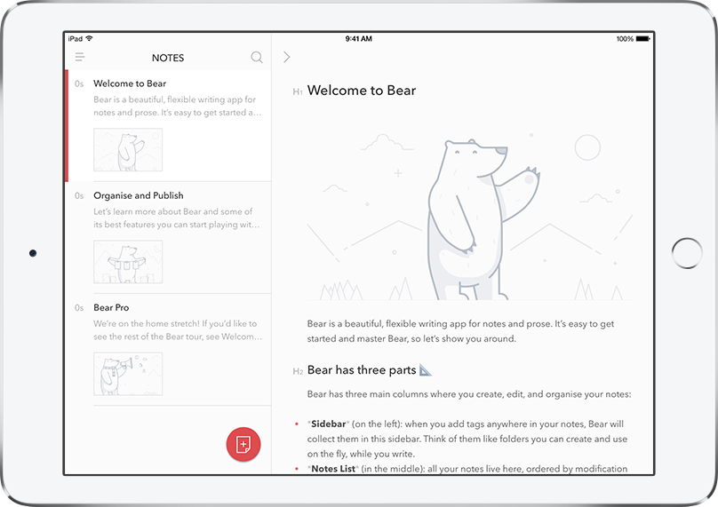 En exlusiva para iPhone, iPad y Mac, Bear es una herramienta elegante y flexible que te permite crear notas y prosa. Con un diseño simple y cuidado, una atractiva tipografía y una experiencia rápida en cualquier dispositivo, Bear ofrece a los escritores la posibilidad de obtener resultados excelentes donde y cuando estén inspirados. Disponible en 11 idiomas y repleto de temas muy atractivos, una amplia gama de herramientas de personalización de tipografía y muchas otras posibilidades, Bear tiene la capacidad suficiente de trabajar con anotaciones cortas, artículos, ensayos, extensos posts para un blog, fragmentos de código y mucho más. La capacidad de Bear se ve reforzada gracias al avanzado Markup Editor, que soporta más de 20 lenguajes de programación y ofrece reconocimiento inteligente de datos y numerosas opciones de exportación. Desarrollado por un equipo de tres personas en Italia, Bear aprovecha al máximo las tecnologías esenciales como Core Data, TextKit / CoreText, Core Graphics, Core Audio, Core Spotlight, sincronización de iCloud, extensiones Share, 3D Touch, Haptic Feedback y VoiceOver para ofrecer la mejor y más rápida experiencia nativa en iPhone, iPad y Mac.