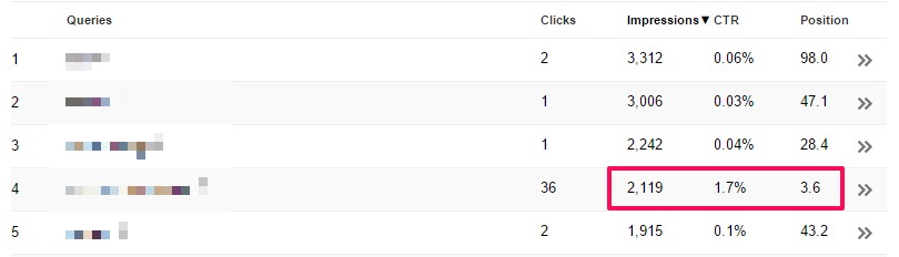 Puedes utilizar el informe de análisis de búsqueda de Google Webmaster Tools para comprobar las impresiones y los CTRs en una serie de consultas. En el siguiente ejemplo, la clasificación de una palabra clave con una posición media de 3,6 está recibiendo un CTR del 1,7%, que es considerablemente inferior a lo que cabría esperar al ver la posición (debería ser de alrededor del 7%).
