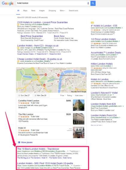 16. Considera cómo es de «clasificable» la palabra clave y el grado de visibilidad de los resultados orgánicos – Hay una serie de factores que tenemos que considerar aquí: ¿Cómo es de poderosa la competencia – es decir, sitios de prestigio como Amazon, Forbes, etc? ¿Cuántos enlaces apuntan a las páginas más destacadas? ¿Son los resultados orgánicos empujados por debajo “del doblez” por la gráfica del conocimiento, las noticias, losanuncios, etc (ver más abajo)?