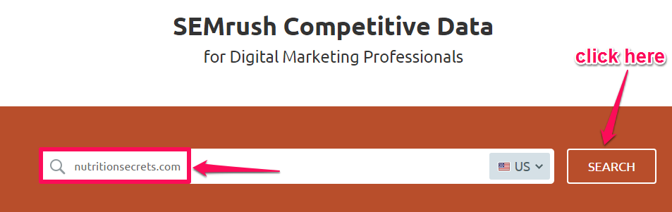 - Ir a SEMrush.com. En la página principal, introduce la URL de tu página (por ejemplo, nutritionsecrets.com). A continuación, haz clic en el botón «buscar» de la derecha: