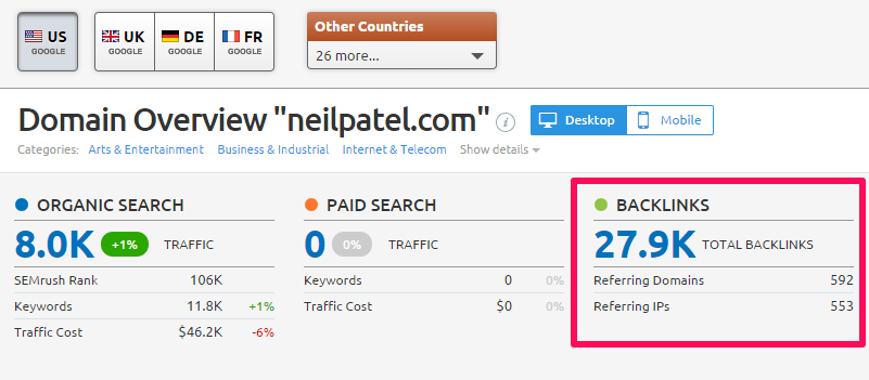 La puntuación de spam de la página anterior es 3. De acuerdo con Open Site Explorer, el 4% de los sitios con una puntuación de spam de 3 fue penalizado por Google. Se quiere medir la relación de los enlaces externos con los dominios de referencia. Para NeilPatel.com, el número de enlaces externos es enorme, pero el número de los dominios de referencia es menor de 600. Esto puede no ser bueno para el SEO – aunque los enlaces parecen naturales y no de spam.
