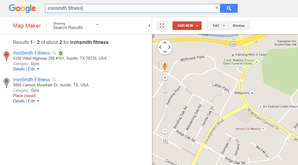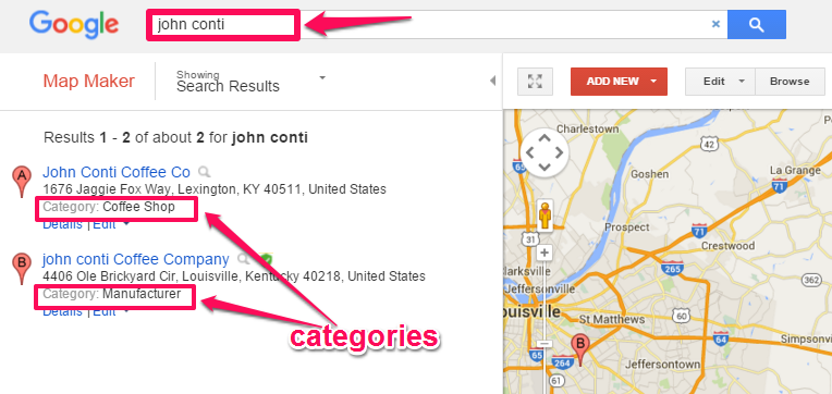 - Asigna la categoría apropiada: No importa qué tipo de negocio estás realizando, hay una categoría adecuada para ello. Como norma general, la categoría principal debe reflejar tu principal negocio (por ejemplo, John Conti Coffee debería ser categorizado dentro de Alimentos y Bebidas).Muchas empresas locales se colocan de manera accidental en categorías irrelevantes, además de la clasificación principal. Si este es el caso, identifica y elimina esas otras categorías.Para encontrar las categorías asignadas a tu empresa en los listados de empresas locales, ve a Google map maker.En el cuadro de búsqueda, introduce tu nombre comercial y haz clic en el icono de búsqueda azul del lado derecho. Podrás ver las categorías: