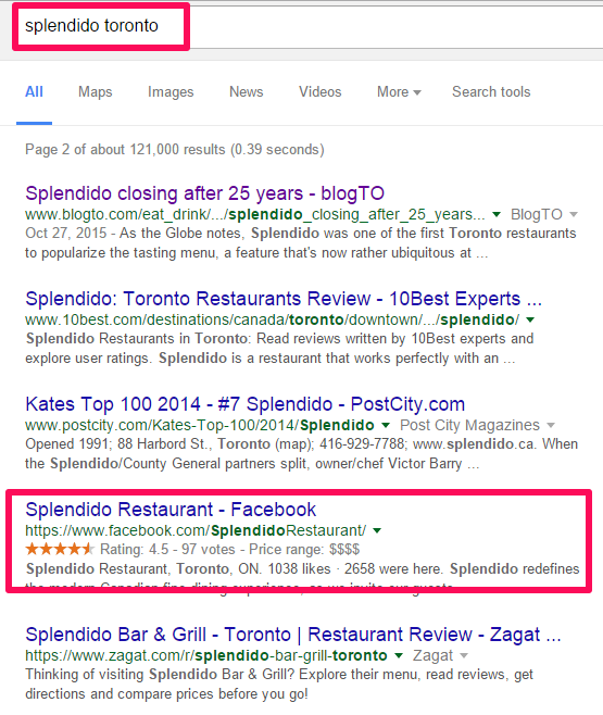 Si descubres que algunos de tus páginas de negocios de medios sociales están funcionando bien (es decir, aparecen en las listas de búsqueda), y otras no, puedes crear nuevas páginas del perfil o actualizar las existentes. A modo de ejemplo, la búsqueda local a continuación es Splendido Toronto, un restaurante popular en Canadá. En la página 2 de los resultados de Google, sólo ves la página de Facebook de Splendido – sin Twitter, LinkedIn, Instagram, etc.