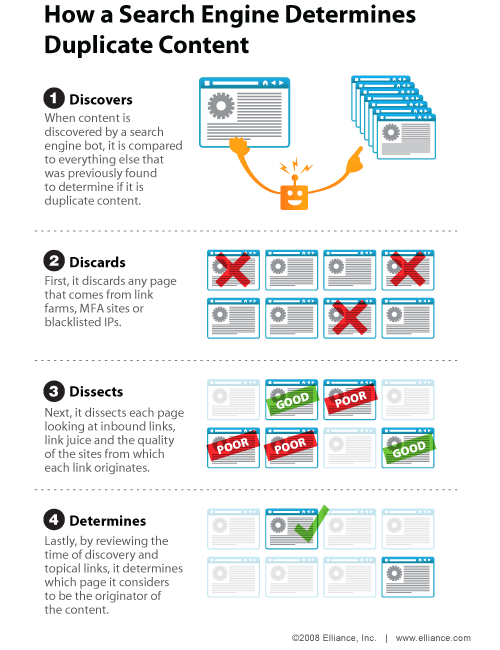 Esto es contenido duplicado, pero no es el tipo de contenido duplicado del que Google quiere deshacerse. Cuando tienes grandes cantidades de contenido en tu dominio, puedes simplemente decirle a Google spider cuál de las páginas quieres indexar. Esto se debe a que la spider se enfrentará a un dilema en cuanto a qué URL debería aparecer en las páginas de resultados del motor de búsqueda (SERPs). AudienceBloom proporciona una imagen más clara de cómo Google determina el contenido duplicado en esta infografía: