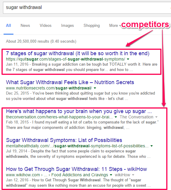 - Comprueba las páginas de resultados orgánicos de la parte superior. ¿Quieres saber que otros competidores están clasificados por delante de ti? Introduce simplemente una de las palabras clave en el motor de búsqueda como esta: