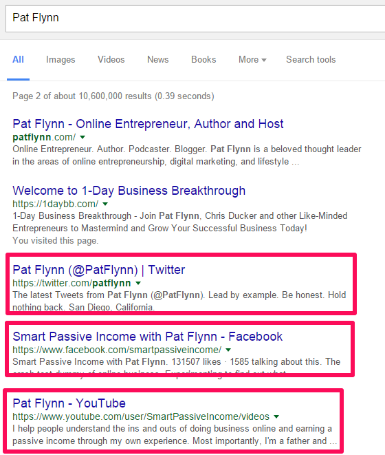 Cuando se trata de determinar tu influencia social, necesitas velocidad. Cuando descubres que tu influencia social se está quedando rezagada (por ejemplo, tu página de Facebook no aparece en el top 10 de las listas orgánicas), necesitas optimizarla o reconstruirla. Vamos a realizar una búsqueda rápida de negocios en Google para determinar en qué redes sociales está el negocio. Usaremos Pat Flynn como un ejemplo. Cuando buscamos «Pat Flynn,» rápidamente puedes comprobar su influencia social en YouTube, Twitter y Facebook. Los enlaces de estos perfiles en redes sociales son jugosos e influyen en el rendimiento de búsqueda orgánica a largo plazo.