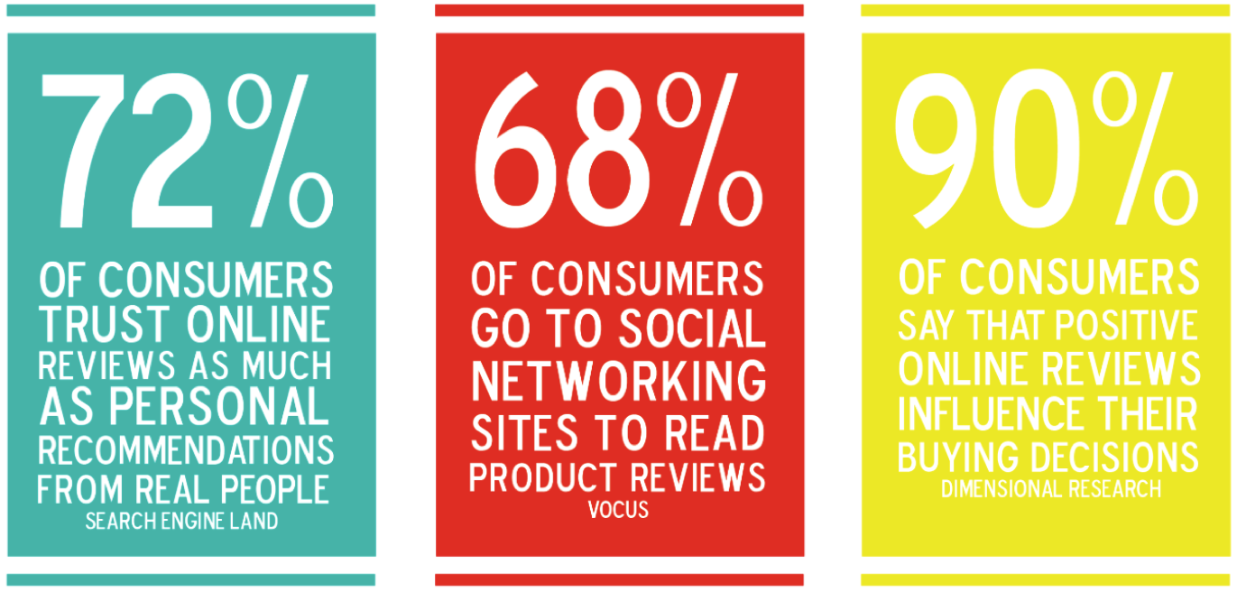 Color verde: El 72% de los consumidores confía en las críticas en línea tanto como en las recomendaciones de las personas reales. Color rojo: El 68% de los consumidores usan las redes sociales para leer críticas de productos. Color amarillo: EL 90% de los consumidores aseguran que las críticas positivas ejercen una gran influencia a la hora de decidirse a comprar.