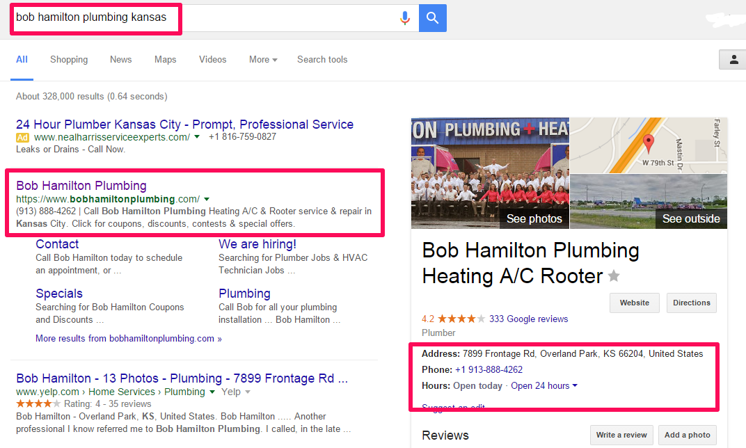 A simple vista, se puede observar que el resultado de la búsqueda local para «Fontanero Bob Hamilton Kansas» devolvió algunos listados locales junto con el gráfico de conocimiento. De hecho, Google reconoce y acredita el nombre comercial con la página web. Esto es algo que va a ocurrir si el negocio lleva existiendo durante algún tiempo. Lo siguiente que necesitarás hacer es comprobar si el nombre de la empresa está unido a un perfil de Google+. ¿Aparece el enlace de la página de Google+ en los listados de búsqueda orgánica? Es vital que el enlace de la página de Google+ aparezca cuando se busca el nombre de la empresa, ya que muestra el nivel de alcance, la influencia y la importancia relativa de la marca del negocio en tu localidad. En las listas de búsquedas locales anteriores, podrás observar que el enlace de la página de Google+ no se muestra. Hay cuatro razones básicas por las que esto podría suceder: