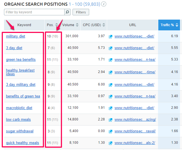 - Analiza las palabras clave orgánicas. A continuación, verás los resultados del rendimiento de las palabras clave orgánicas.Presta atención a las palabras clave orgánicas y a sus posiciones (en que posición del ranking están las palabras clave actualmente).