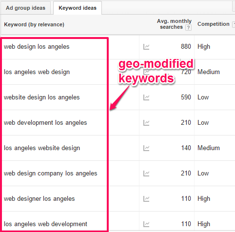 Palabras clave geo-modificada vs palabras clave geofocalizadas: La mayoría de los SEO piensan que estos dos términos significan lo mismo. Pero eso no es del todo correcto. Geo-modificar una palabra clave simplemente significa que vas a añadir calificativos tales como la ciudad, el estado, el país o el nombre de tu palabra clave principal. Algunos ejemplos de frases de búsqueda geo-modificadas son: