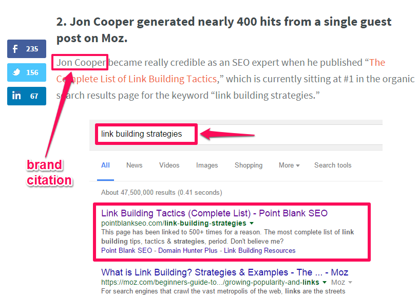 Antes he hablado de los efectos indirectos de las señales sociales, lo que conduce a un aumento de las citas debido a la imagen de marca. La mención de una marca es una situación en la que otro sitio menciona tu página web, el nombre de tu negocio o tu nombre personal, sin enlazarlo con tu página o perfil social. Un ejemplo de una mención de la marca en la pantalla de abajo es «Jon Cooper.» A pesar de que he mencionado su nombre, no hay enlaces a su blog.