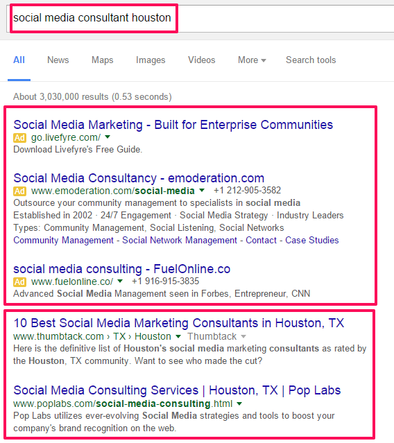 El propósito de investigar en las búsquedas locales es averiguar si hay empresas locales que compiten por tus palabras clave. Estás interesado tanto en los resultados de búsqueda orgánica como de pago (AdWords). Para ser eficaz en esto, vamos a suponer que eres un “asesor de redes sociales de Huston”. Todo lo que tienes que hacer es introducir la frase de palabras clave en el buscador y verás a tus competidores locales.