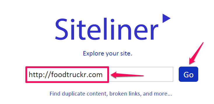 - Ve a SiteLiner.com. En el cuadro de búsqueda, escribe la dirección URL de la página. A continuación, haz clic en el botón azul «Go»: