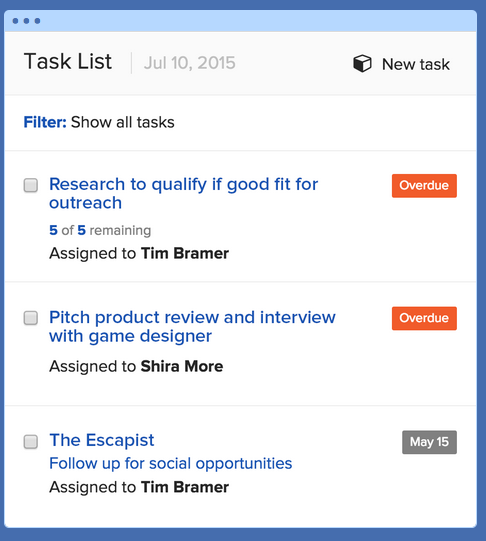 - Administra tus muchos proyectos de creación de enlaces. Los mejores proyectos de creación de enlaces son administrados de manera eficaz y organizada de principio a fin. BuzzStream dispone de herramientas para el seguimiento de todos los aspectos de tus campañas. Por ejemplo, puede establecer recordatorios para los seguimientos de divulgación y así poder compartir tareas con los miembros del equipo.