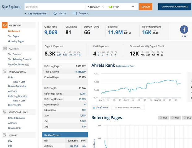 Junto con Link Manager, querrás incorporar el uso de la función Google Rankings. Esto te da acceso a las clasificaciones de palabras clave directamente desde Google y Bing. Una cosa es crear enlaces, y otra cosa completamente diferente es crear enlaces que produzcan resultados. Así funcionan los rankings. Raven tiene algunas herramientas de SEO que te darán una mejor visión de la creación de enlaces. 5. Ahrefs – Con una de las bases de datos más grandes y más precisas de los enlaces externos, ganarás mucho valor con la gama completa de herramientas Ahrefs. Hay seis herramientas distintas, incluyendo: